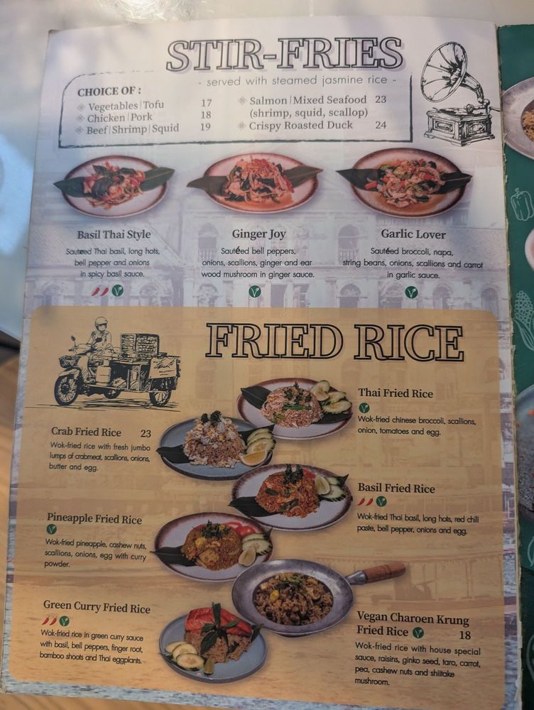 Jasmine rice stir-fried in green curry sauce with basil, bell peppers, bamboo shoots & Thai eggplants.